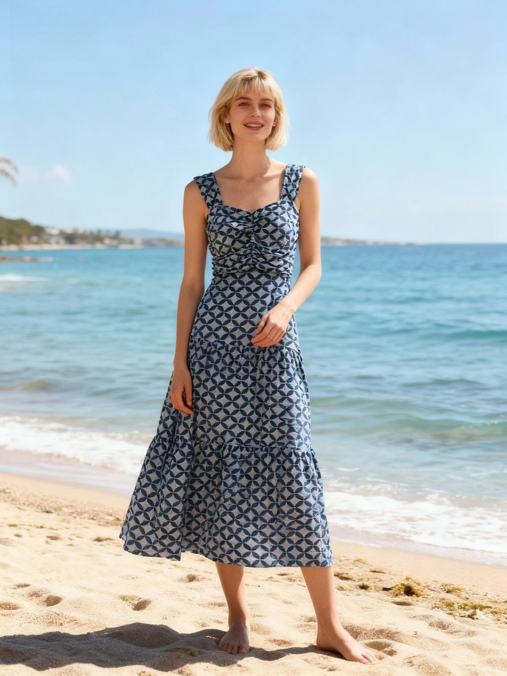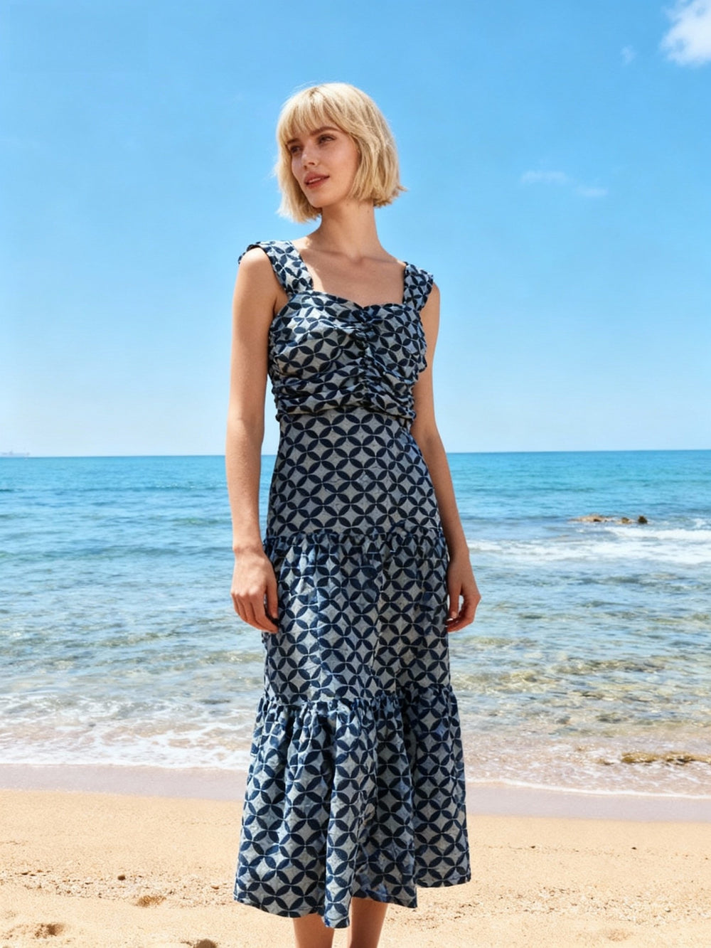 Imagine the sound of waves and the warmth of the sun—this is the essence of our Geometric Cadence Dress. Featuring a sophisticated square neckline and elegant bust detailing, it frames you beautifully. The tiered skirt dances with every step, while the unique geometric print in shades of blue mirrors the sparkle of the sea. Whether you're strolling along the beach or enjoying a seaside cocktail, this dress ensures you’ll shine with effortless, jet-setter elegance.